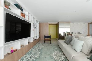 A materialidade do projeto aposta na combinação harmoniosa de superfícies e texturas que reforçam a atmosfera serena do apartamento. O piso de tábuas de cumaru percorre todos os ambientes, exceto a cozinha, com ladrilho hidráulico, e os banheiros, revestidos em porcelanato cinza.