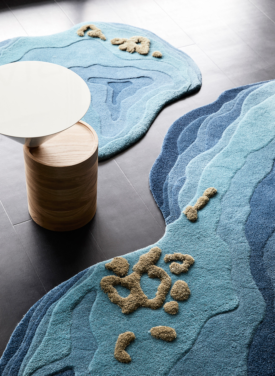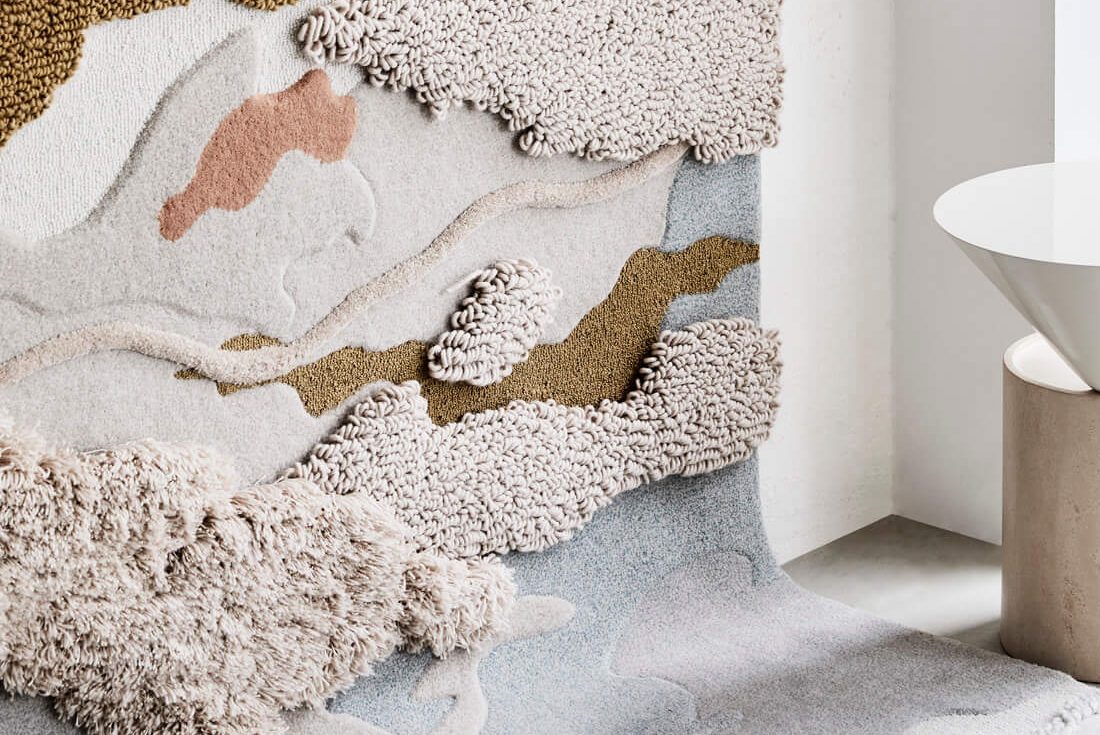 Modelos de tapetes que percorrem as superfícies de parede e piso, sob texturas tufadas e formatos irregulares e orgânicos. Por Tsar Carpets