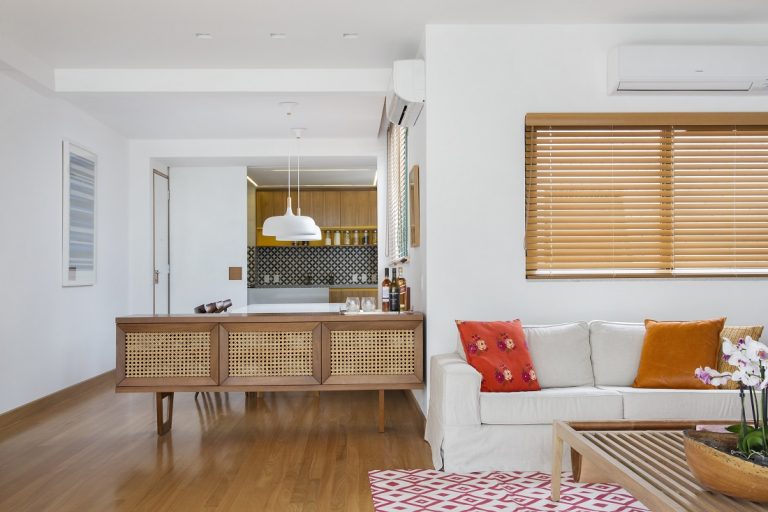 Apartamento paulistano da arquiteta Carina Dal Fabbro tira máximo proveito da conexão entre os espaços, mistura móveis cheios de histórias e valoriza as peças de família Texto: Dan Brunini | Fotos: Rafael Renzo A vida ganha novos capítulos e os momentos com a casa acompanham cada mudança. E, assim, a arquiteta Carina Dal Fabbro e o marido Marcelo vieram para este apartamento de 92 m², nos Jardins, em São Paulo. Junto, o casal deixou os espaços do jeito que sonhava, com a área social totalmente integrada, onde sala de estar, TV, jantar e cozinha formam um único lugar, sempre pronto para receber a família e os amigos. “Renovamos a decoração e buscamos deixar o nosso lar ainda mais lindo, moderno, confortável e, sobretudo, com o nosso estilo”, conta Carina. A arquiteta é do time dos profissionais que gosta de inventar novos usos para os mobiliários, reaproveitando o máximo de peças. Um exemplo é a mesa de centro de madeira, que já foi usada como banco no outro imóvel e ficou ainda mais charmosa com os livros e plantinhas no coração do living. “Para a sala de estar, queríamos um ambiente confortável para assistir