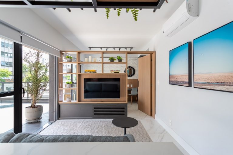 Com duas cozinhas e vista panorâmica para o campo de golfe olímpico, apartamento aposta nos tons neutros e painéis de madeira para realçar a sensação de conforto Produção visual: Cristina Côrtes, com Andréa Falchi | Fotos: Denilson Machado e Juliano Colodeti/MCA Estúdio Este apartamento de 380m², na Barra da Tijuca, RJ, foi passou por reforma e decoração assinados pela arquiteta Cristina Côrtes para receber um executivo e sua filha adolescente. Como a mãe do proprietário costuma passar os finais de semana com o filho e a neta, ela ganhou uma suíte no novo apê só pra ela. Juntos, mãe e filho dividem o amor por cozinhar. Por isso, ele pediu uma atenção especial à cozinha principal e ainda uma cozinha gourmet, na varanda da área social, para receber amigos e familiares. Com vista panorâmica para o campo de golfe olímpico, com a praia da Barra da Tijuca ao fundo, a sala de estar e jantar conquistou ainda mais amplitude integrada à varanda, onde fica a cozinha de apoio. A paleta de tons neutros destaca ainda mais as texturas dos revestimentos e mobiliário. Os painéis de parede em madeira escura aquecem a área da sala, conferindo