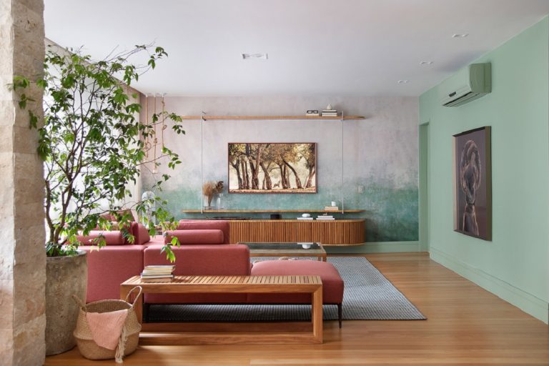 A área social deste apê carioca passou por uma transformação ancorada na paleta cromática e nos materiais inspirados na natureza.