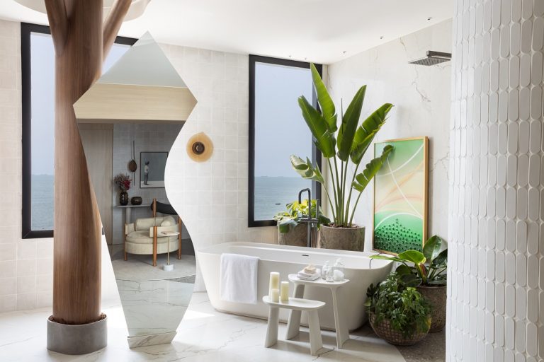 Na Riviera de São Lourenço, litoral paulista, casa foi pensada para receber a família com uma atmosfera convidativa e confortável A casa de praia de 265m² possui tons amadeirados, beges, off white, azuis e verdes, passando uma energia rústica e natural que combina com a sua localização, a praia de Riviera, Litoral Paulista. A família, composta pela mãe, pai e seus filhos gêmeos, queria um espaço que fosse prático e confortável, perfeito para receber amigos e familiares, e a arquiteta Sabrina Salles atendeu esses pedidos com maestria. Na área social, a arquiteta trouxe um espaço amplo e integrado, com a praticidade tão desejada pelo casal, com grandes sofás e mesas para refeições. A unificação de living e cozinha facilita a interação, mesmo quando os anfitriões estão preparando um jantar e os convidados estão na sala. A cozinha, projetada em mármore e tons mais sóbrios, tem uma linda vista para as plantas e para a piscina da casa. O projeto harmoniza a natureza com a praticidade garantida pelos equipamentos modernos. O projeto esbanjou paineis de madeira mais claros, que além de passarem uma sensação mais iluminada para o ambiente, transformam o living sem fugir da proposta praiana. Na suíte master, a